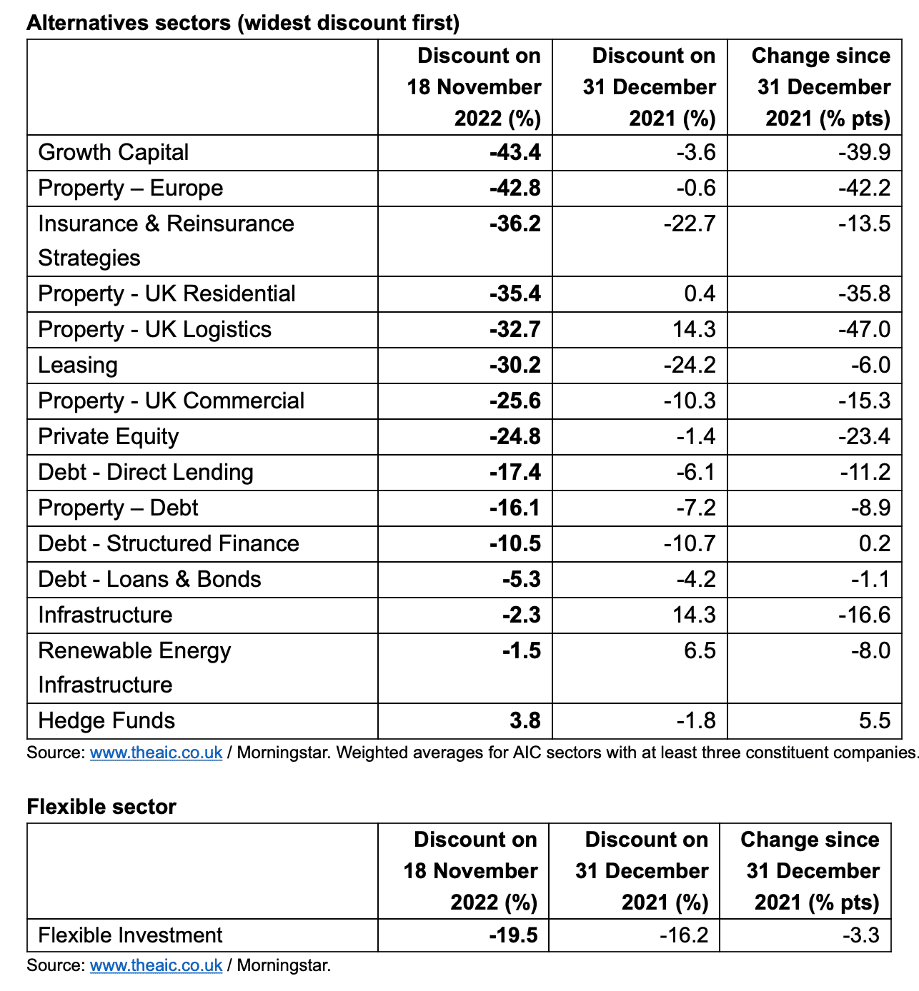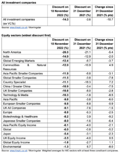 Figures from the Association of Investment Companies (AIC) show that since the beginning of the year the discount of the average investment company has widened more than 10 percentage points – from 3.6% on 31 December 2021 to 14.3% on 18 November 2022. With almost all investment company sectors on a discount, the Association has published a list of average discounts across all equity and alternative sectors (see tables below).