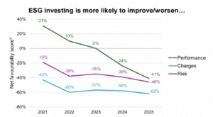 Despite 96% of advisers now recommending sustainable funds, they are generally pessimistic on ESG fund performance, with just 10% expecting ESG investing to improve performance and 51% expecting it to worsen returns – a net favourability score of -41%. This continues a downward trend in performance expectations since 2021, when a net 31% of respondents expected ESG to improve performance.