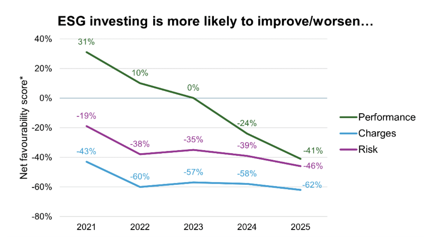 Source: AIC/Research in Finance. * Net favourability score is the % of respondents who expected ESG investing to improve performance, charges or risk minus the % who expected it to have a detrimental effect.