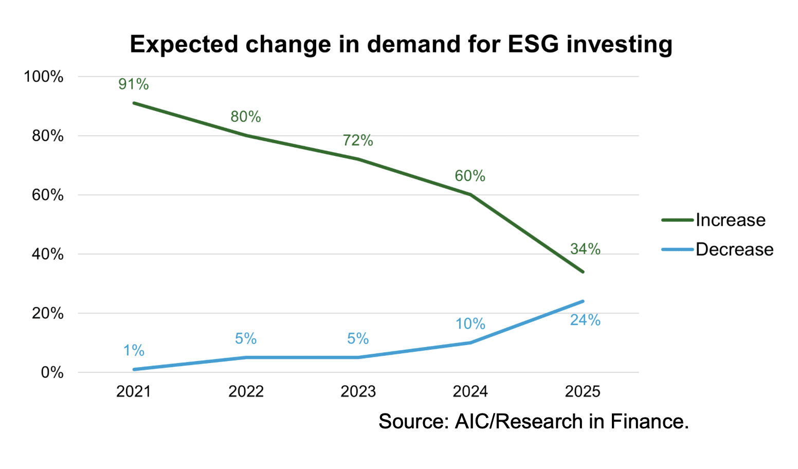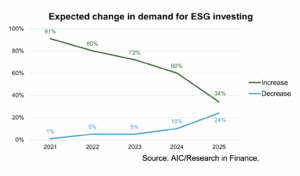 The research found that only 11% of clients proactively raise the subject of ESG in meetings, down from 13% last year and 20% in 2022. While the percentage of intermediaries who expect ESG demand to increase over the next 12 months has fallen from 60% last year to just 34% this year. The percentage who expect demand to decline has increased from 10% to 24%.