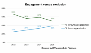 Nick Britton, Research Director of the Association of Investment Companies (AIC), said: “The question of engagement versus exclusion divides intermediaries. While most still like the idea of engagement in principle, there are also murmurs of doubt about how effective engagement is and whether asset managers are prepared to divest if it doesn’t work. That scepticism could be behind the rising interest in exclusion, which is a simpler approach for funds to demonstrate and for advisers to explain to clients.”