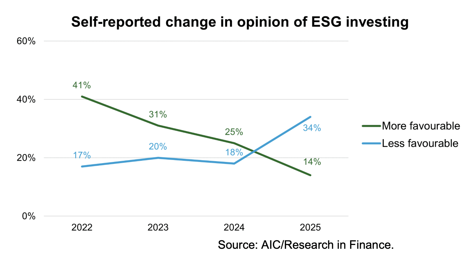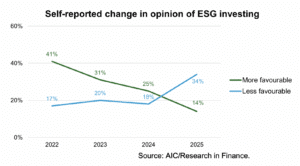 Overall, the report found that intermediaries’ general opinion of ESG investing has declined for the first time in four years. A third of respondents (34%) reported that their opinion had become less favourable, while only 14% had adopted a more favourable view.