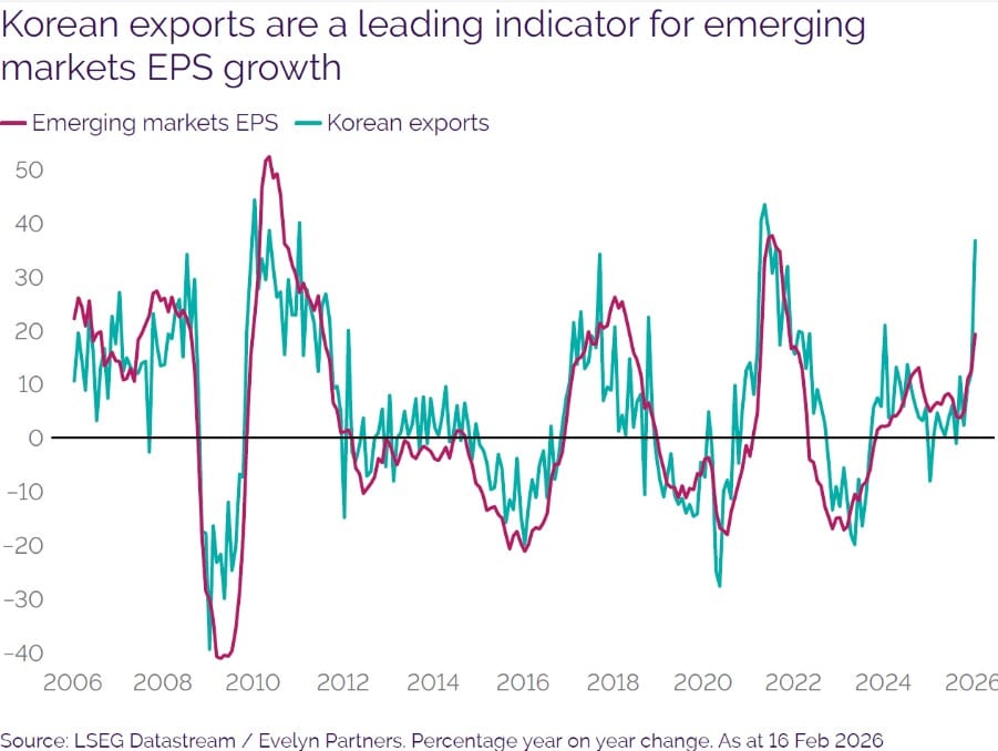 This is already visible in Korea, a manufacturing hub for global technology products, where, in January, its exports surged 36% from a year earlier, the fastest pace since the pandemic. Korean exports have a tight relationship with EM EPS.