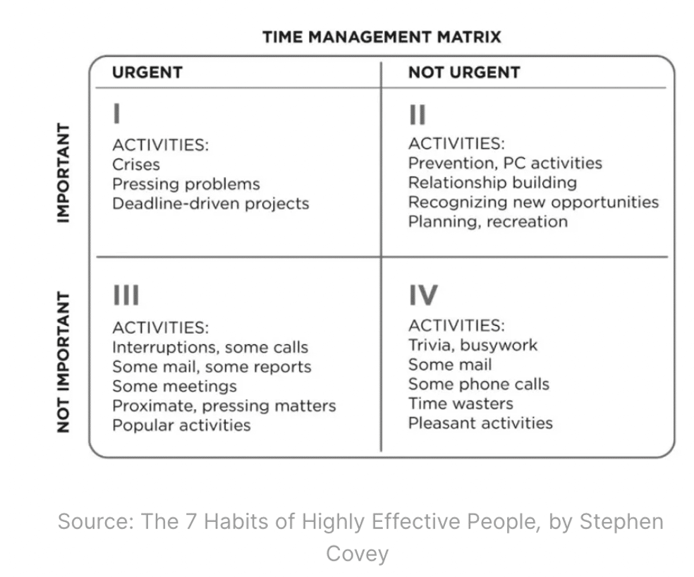 This is the thief of time from quadrant 4. Just because something is urgent, doesn’t necessarily mean it’s important. The majority of things that people feel are urgent probably aren’t that important.