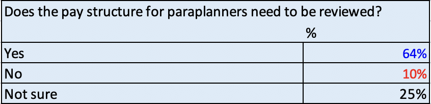 Asked whether the pay structure for paraplanners should be reviewed given the role paraplanners now play in financial planning, nearly two thirds (64%) agreed. In stark contrast, just 10% of paraplanners said the industry did not warrant a general pay review.