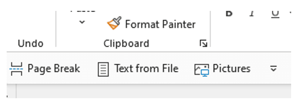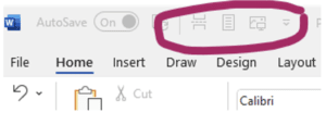Once you realise the really useful features in Word, you can start adding them to the Quick Access Bar to make it much easier and quicker to use them. My go-to adds here are Insert File, Insert Picture, Insert Page Break and Format Painter. If you haven’t paid any attention to the Quick Access Bar before, it will be on the top of your window like this: