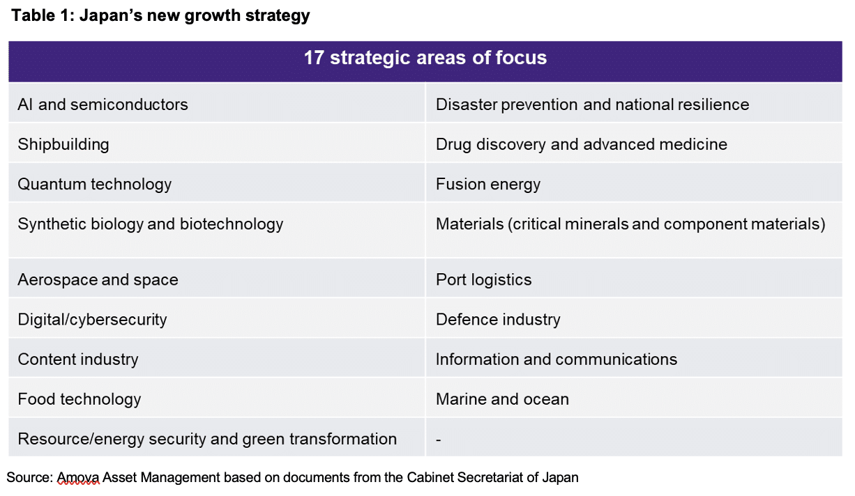 The formation of the Takaichi administration in October also marked a decisive shift in Japan’s political and economic trajectory. The new coalition government, under Japan’s first female prime minister, has signalled a willingness to use spending measures to stimulate domestic demand and indicated that it is focused on strengthening the supply side by formulating measures to promote public-private investments in 17 strategic areas (Table 1).