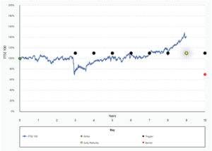 Lowes explains the timeline for the April 2017 Plan and how it affected investor returns: “For the first 34 months the FTSE was relatively benign, and two months before the first potential maturity date it was only 117 points above where it had started. Then came the pandemic driven market crash, which briefly pushed the FTSE below 5,000. An April 2020 maturity became highly unlikely – however, with a gain of 11.75% accruing each year, a delayed maturity was far from a bad outcome.