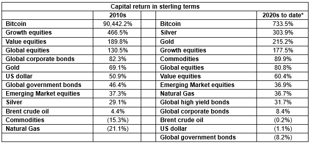 AJ Bell’s high level overview illustrates that Bitcoin, equities and bonds did best for investors in the 2010s, while commodities lagged. The picture is very different in the 2020s, as commodities are coming into their own and government bonds, allegedly a safe option, are doing worst.