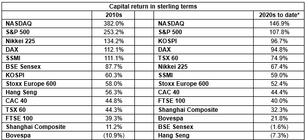 Similarly unsubtle shifts in where portfolios have needed to go to get the best returns can also be seen in how different equity markets are coming to the fore in the 2020s, in comparison to the 2010s.