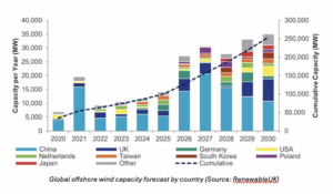 Global offshore wind capacity forecast by country (Source: RenewableUK)