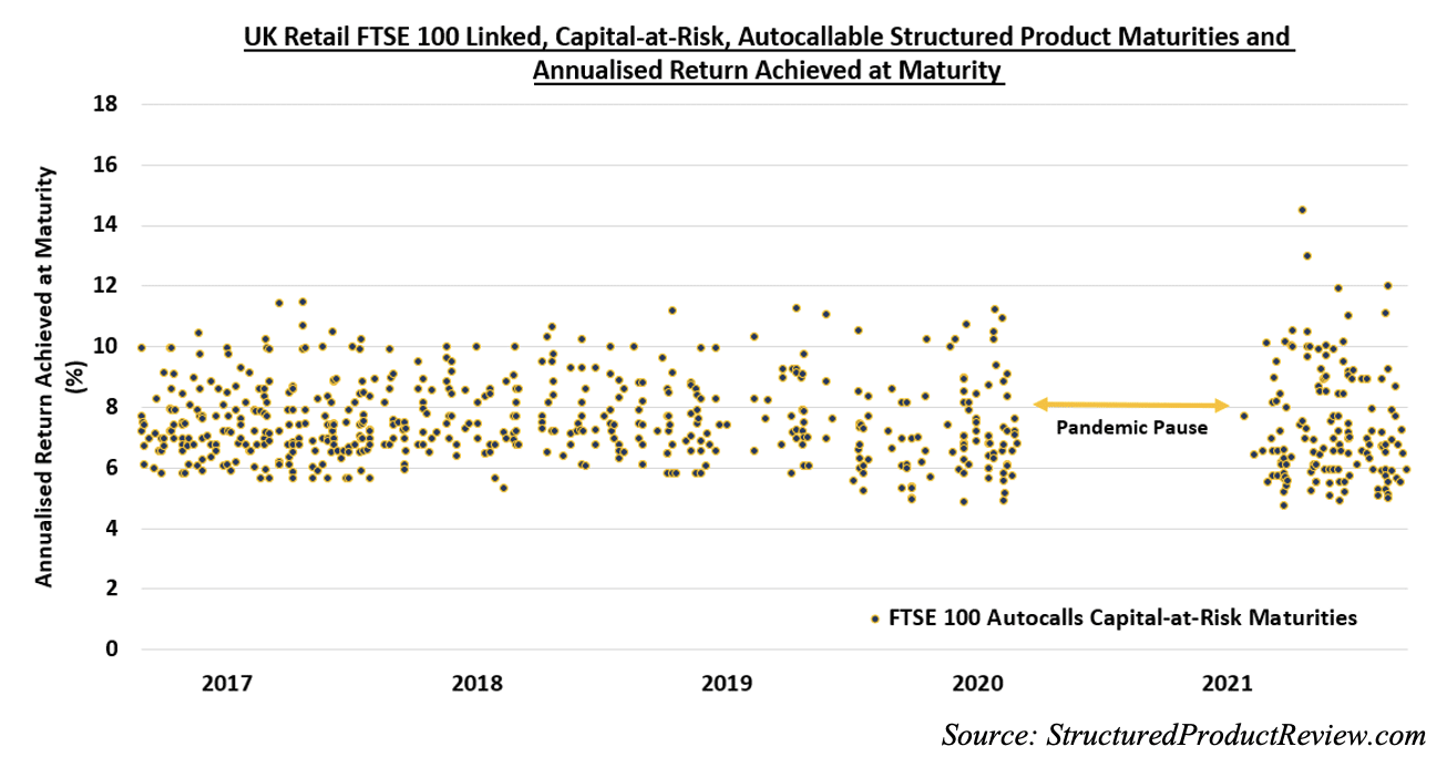 The chart below plots all FTSE 100 linked autocall structured product maturities from 2016 to date, by reference to the annualised return they achieved on maturity.