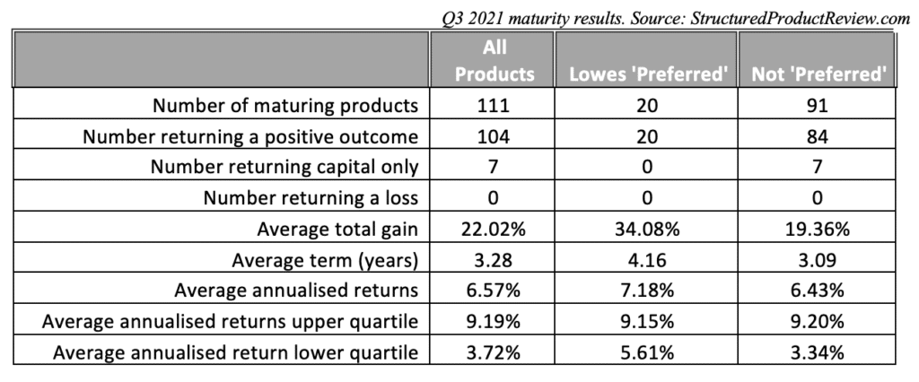 Josh Mayne, Lowes Financial Management, looks at how structured products performed for investors as per the maturities results of Q3 2021.