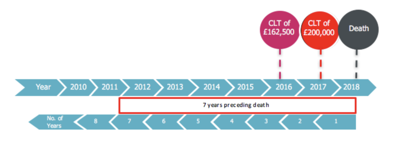 * The timeline above shows that both CLTs are in the 7 years preceding death. The first CLT has already used £162,500 of the nil rate band. The second CLT has used the remaining £162,500 of the nil rate band and there was an entry charge on £37,500 of the £200,000 gift at the rate of 20% (half the death rate). See however ‘grossing up’ comments above.