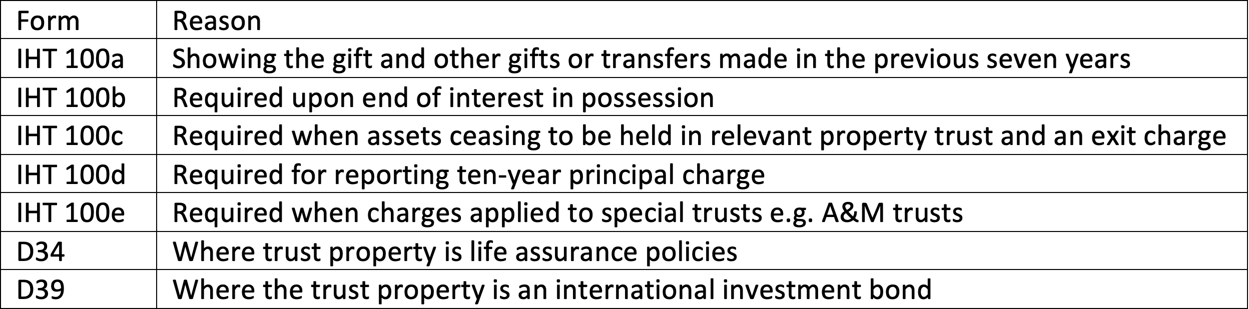 A full list of the supplementary forms that trustees may need to use for reporting can be found here: Inheritance Tax account (IHT100) – GOV.UK (www.gov.uk)