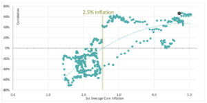 Figure 1 highlights the correlation between bonds and equities, appearing to move increasingly positive once inflation is 2.5% or higher. The dark blue dot is the latest observation.