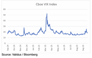 Finally, derivative markets are starting to show signs of stress. The VIX index (often described as the market’s fear index) spiked last week to its highest level since April. Granted, it’s a long way from the dizzying heights reached in April post Liberation Day, but a jump in option volatility is reminder that the market remains on tenterhooks.