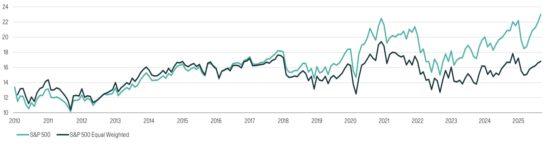 S&P500 Index and S&P500 Equal Weighted Index, price earnings ratio 2010 – current