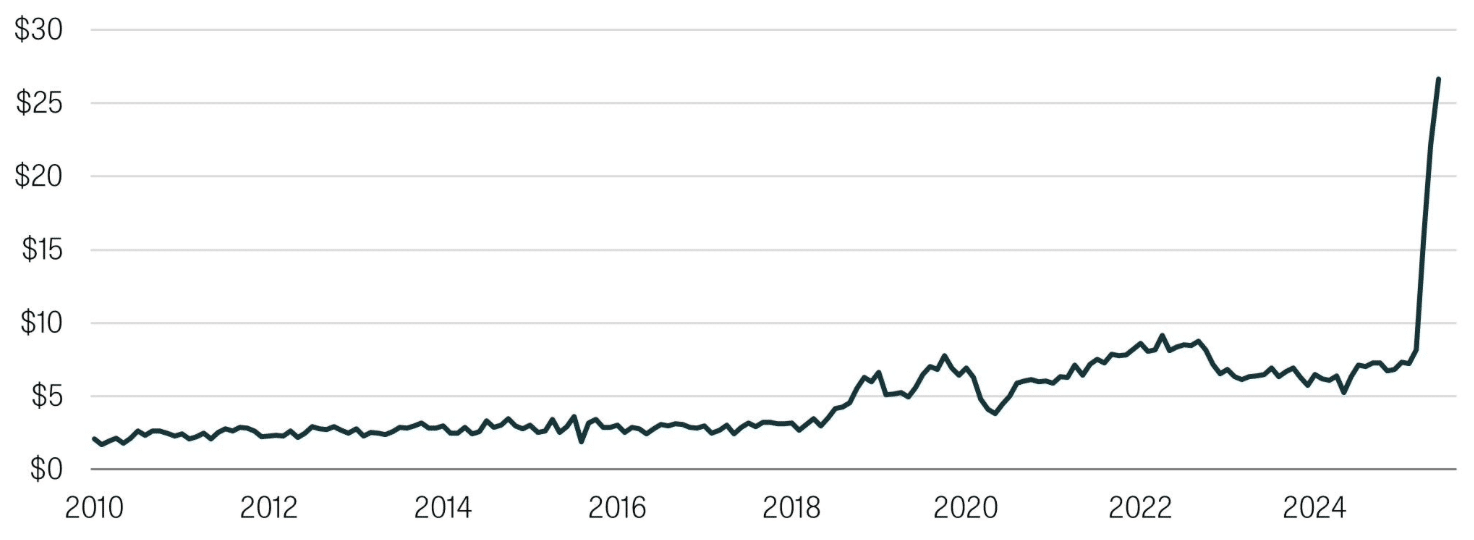 US Customs Duties Revenues, US$ billion, 2010-2025 monthly