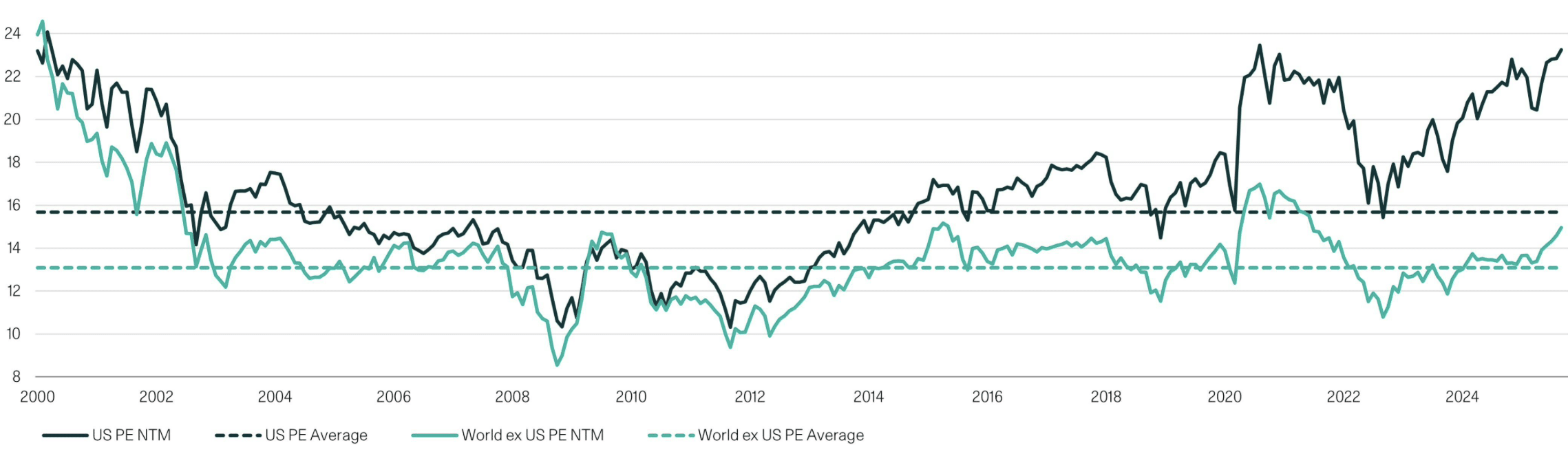 MSCI US and MSCI Global ex US price–earnings ratio based on next 12 months earnings